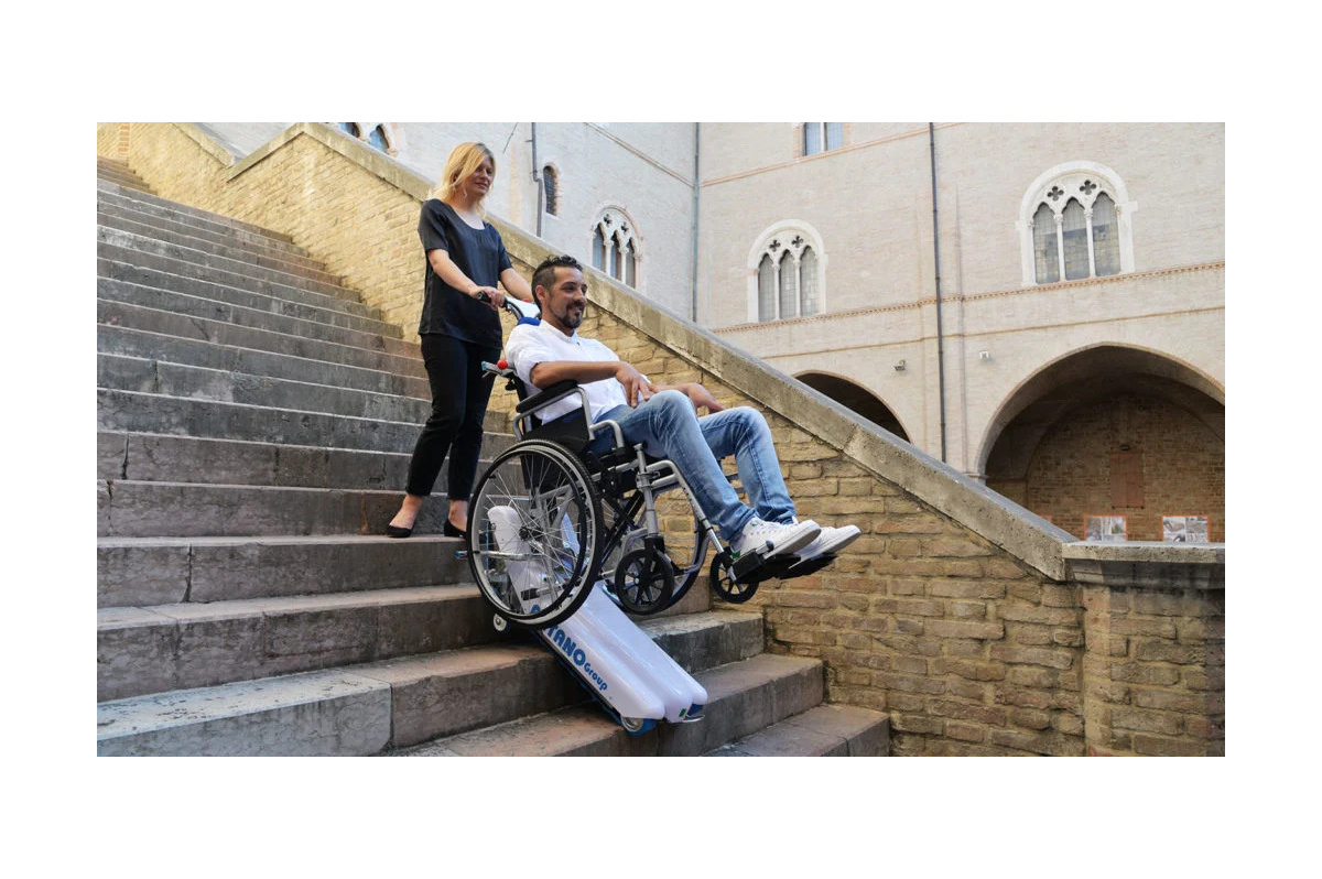 Schodolez LG 2004 je praktickým a spolehlivým řešením pro bezpečný pohyb invalidního vozíku po schodech. Má ruční systém otáčení s pomocnými koly a skládací tažnou tyč.