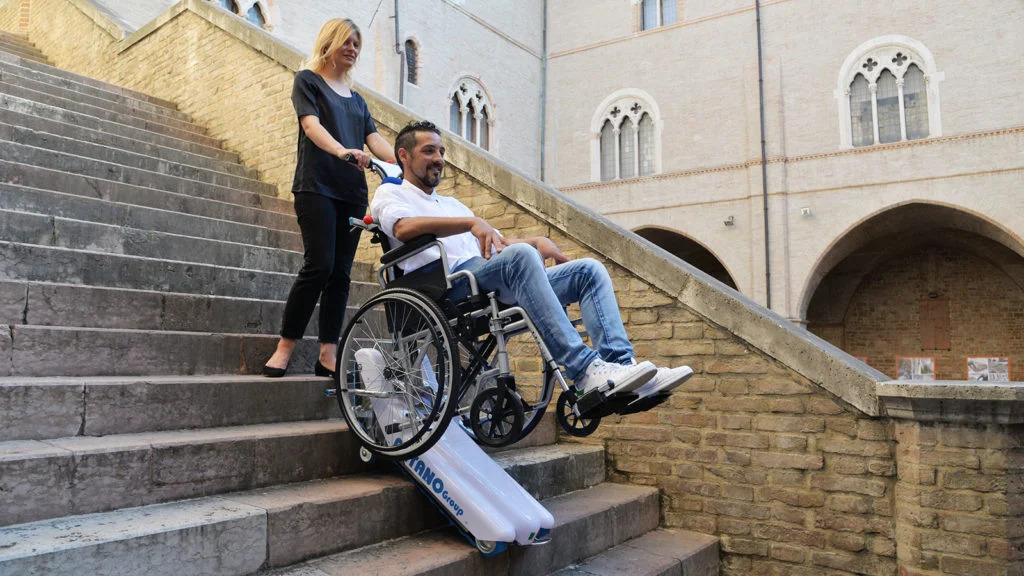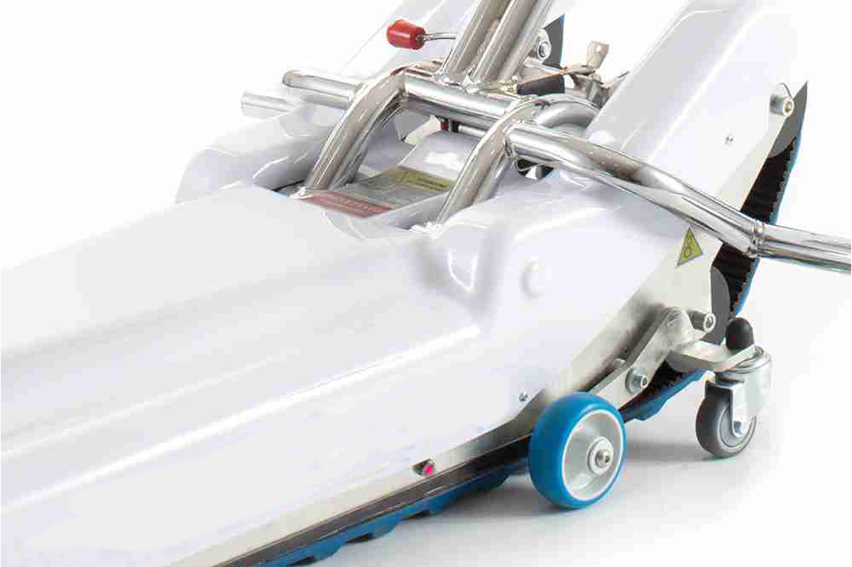 Bezpečný a spolehlivý schodolez k invalidnímu vozíku vybavený pásy.