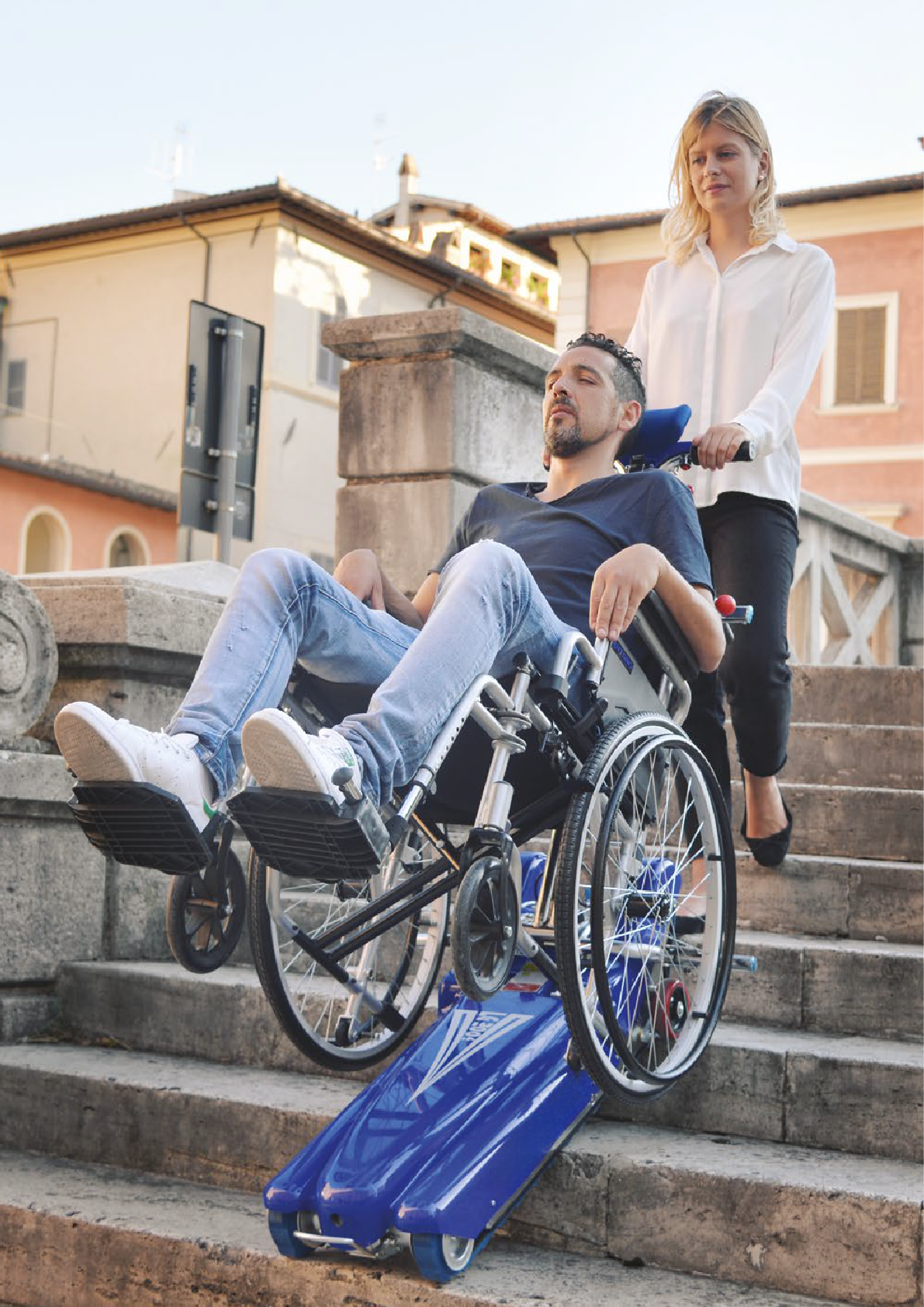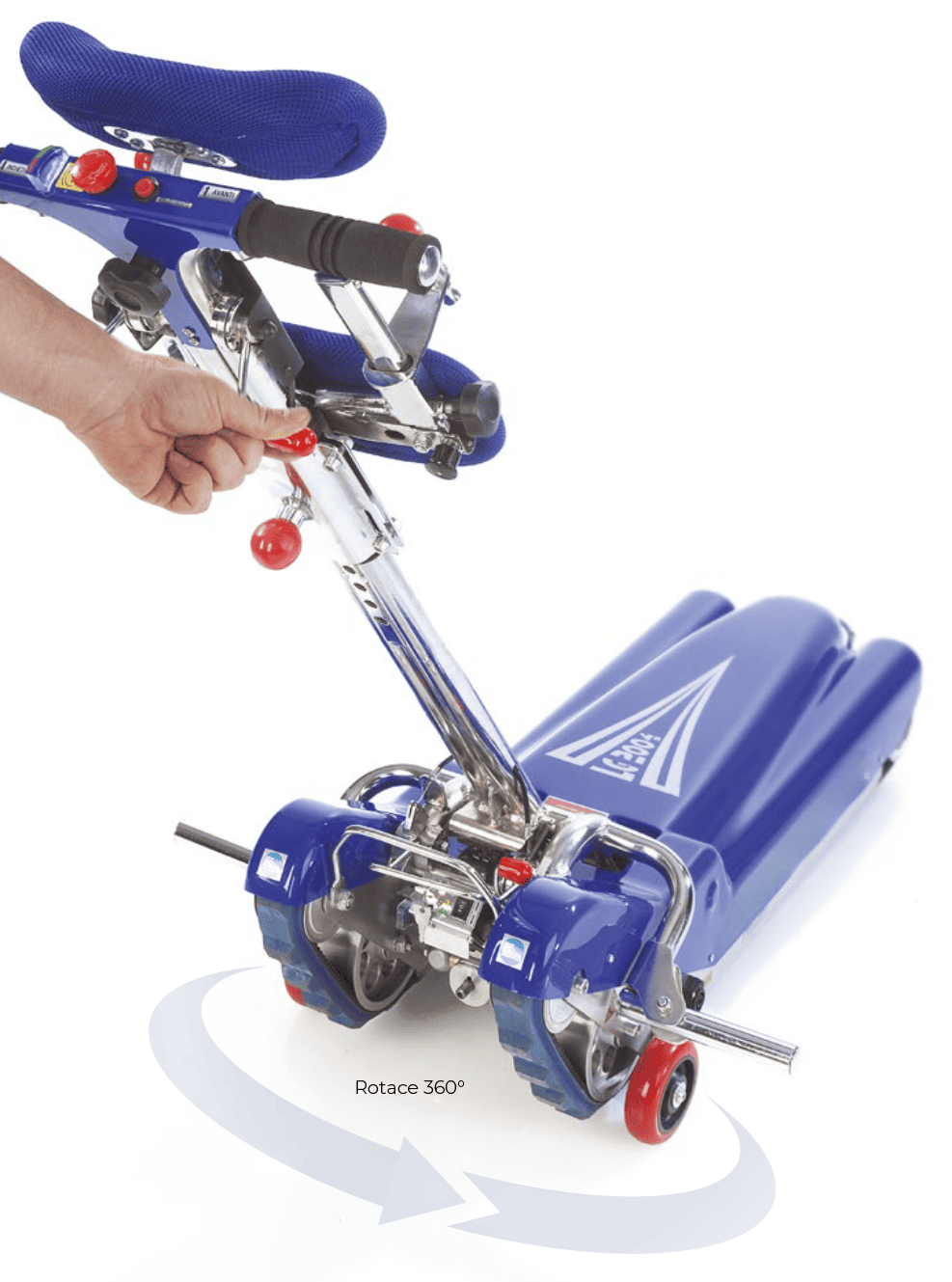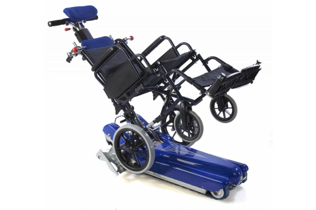 Schodolez pásový k invalidnímu vozíku 150 umožňuje bezpečný transport osoby na invalidním vozíku po schodech. Patentovaný systém otáčení zajišťuje snadnou manipulaci i v úzkých prostorech, disponuje vysokou nosností 150 kg a poskytuje dlouhou provozní výdrž.