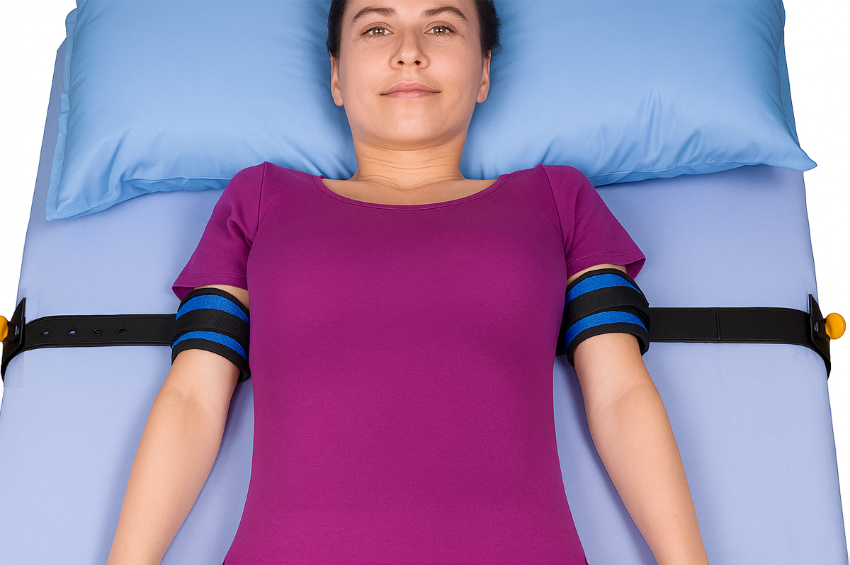 Pohodlné zařízení z neoprenu pro zajištění pacienta a pro rychlé nasazení a uvolnění. Zabraňuje pacientovi vypadnutí z lůžka nebo sebepoškození, vhodné pro pohotovostní služby, neurologii a JIP, kde je čas rozhodujícím faktorem.