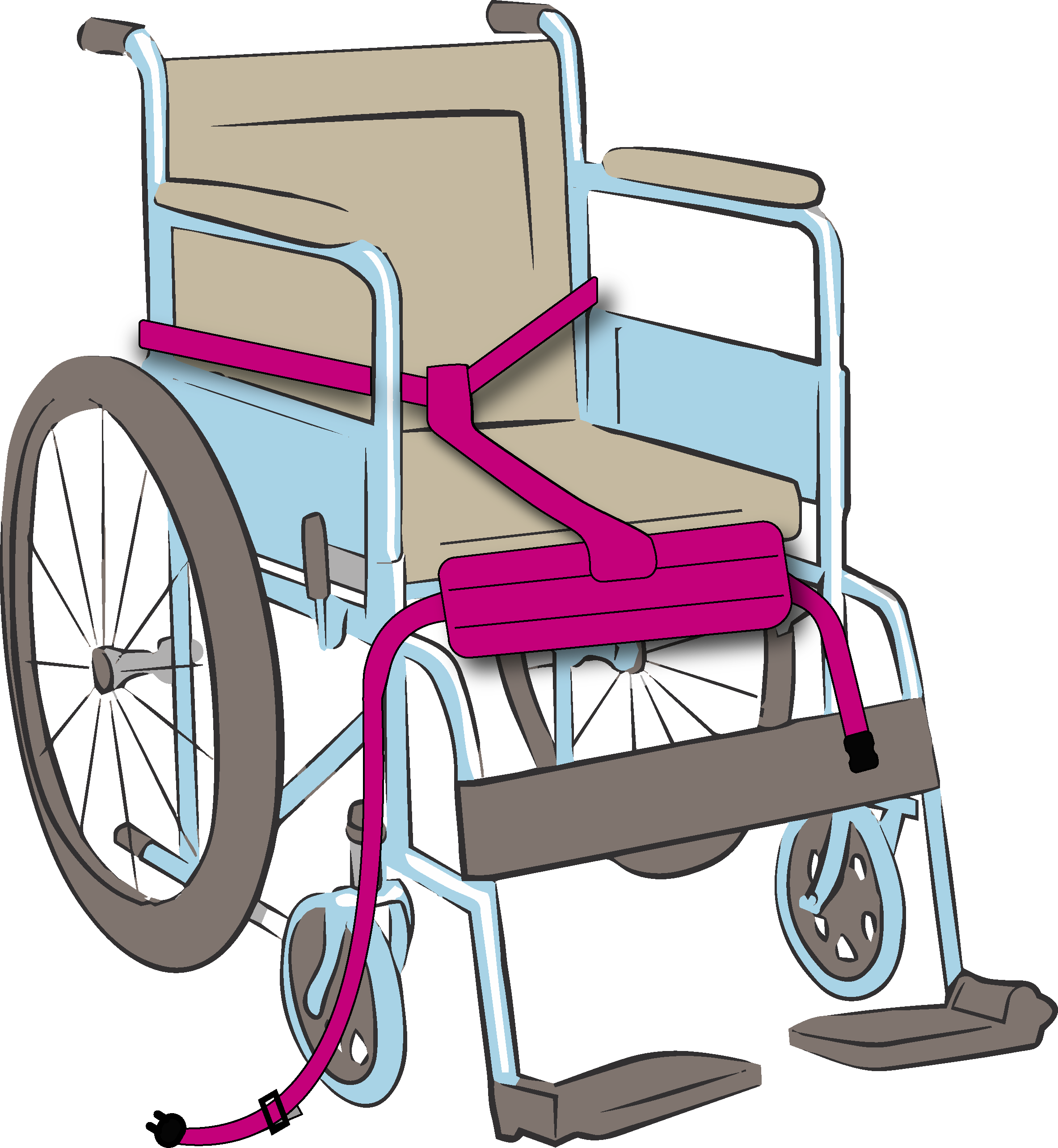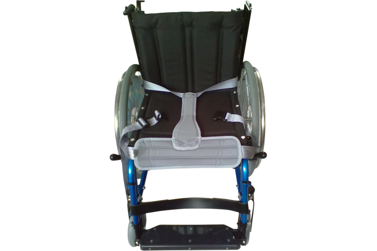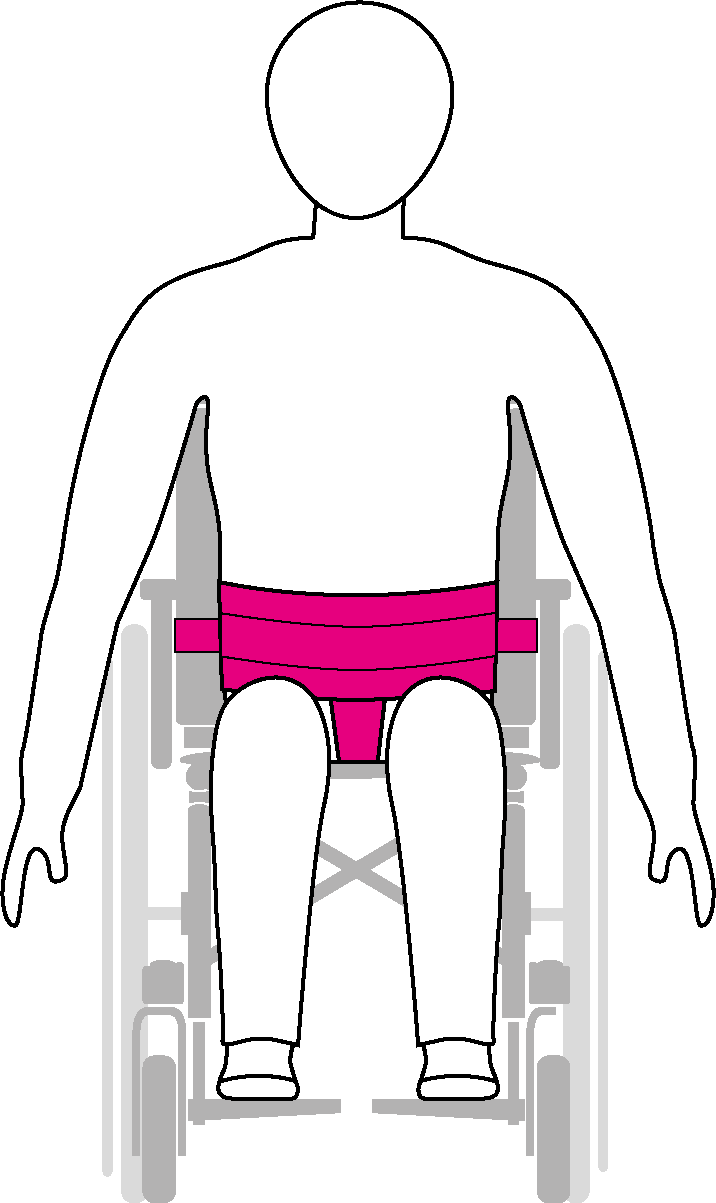 Břišní pás pro fixaci osoby v invalidním vozíku. Osobu fixuje v pase a v rozkroku a zabraňuje tak jejímu sklouznutí z vozíku.