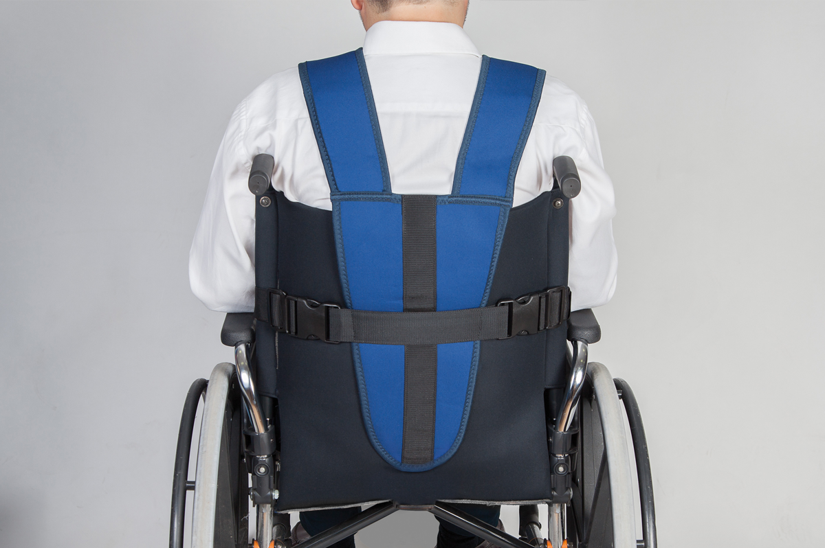 Vesta na přezky zajišťuje bezpečné a účinné uchycení pacienta k invalidnímu vozíku, umožňuje úplnou volnost pohybu končetin a zároveň zabraňuje předklonu nebo houpání, čímž zlepšuje stabilitu postoje.