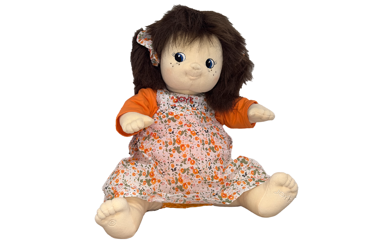 Sedící panenka střední velikosti Paula v pruhovaných šatičkách s hnědými culíky. Má v boku všitou kapsičku pro vkládání modulů, které lze dokoupit ( tlukoucí srdíčko)