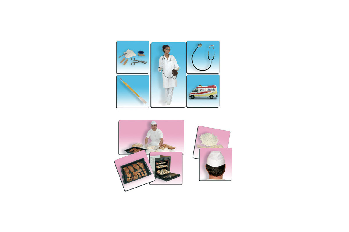 | Obsah balení | celkem 60 karet - 12 karet o rozměrech 15×8 cm znázorňuje povolání, 48 kartiček o rozměrech 7,5×7,5 cm vztahujících se k povolání, zadní strana karet obsahuje označení pro kontrolu správnosti |