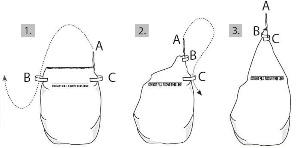 • rozvazování pytle: postupným provlečením smyčky A poutky C a B